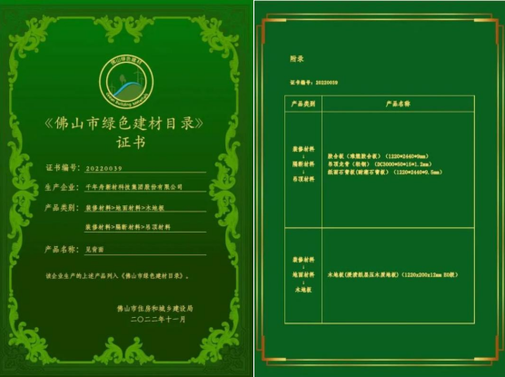 此前,经过第三方严谨审核,千年舟难燃胶合板、木地板、轻钢龙骨、纸面石膏板等产品符合相关绿色建材认证标准,获得《佛山市绿色建材目录》证书。